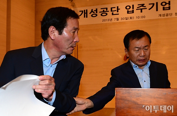 개성공단 출입차단 119일째를 맞는 30일 오전 서울 여의도 중소기업중앙회에서 열린 개성공단 입주기업 비상대책 회의에서 정기섭 기획분과위원장이 발표할 성명서의 일부분이 협의한 내용과 다르다며 한재권 공동대표위원장에게 항의하고 있다. 노진환 기자 myfixer@