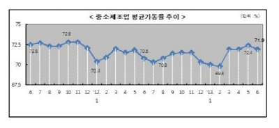 중소기업중앙회는 1382개 기업을 대상으로 조사한 결과 지난달 중소제조업 평균가동률이 전월대비 0.5%포인트 하락한 71.9%로 집계됐다고 30일 밝혔다.