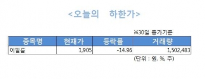 30일 국내 주식시장에서는 유가증권 상장사인 이필름 한종목만이 하한가로 내려 앉았다.