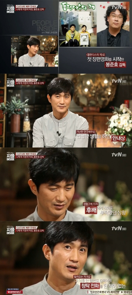 안내상은 30일 방송된 tvN '백지연의 피플인사이드'에 출연해 봉준호 감독에게 배역을 청탁할 만큼 어려워던 과거 생활고를 털어놨다.