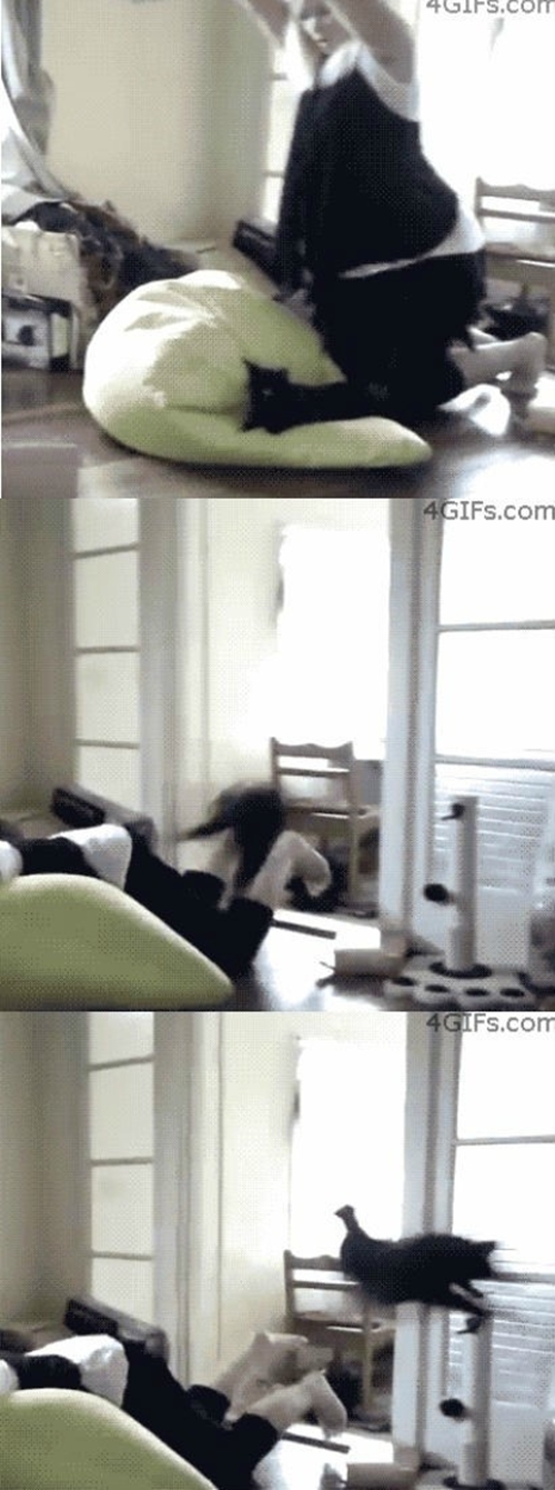 잠시 뒤 이 고양이는 주인의 배신으로 엄청난 반전을 겪는다. 누군가 다가오는것을 눈치채지 못한 고양이는 주인이 갑자기 소파를 덮치자 엄청난 반동으로 날아서 화면 밖으로 사라져 버린다.