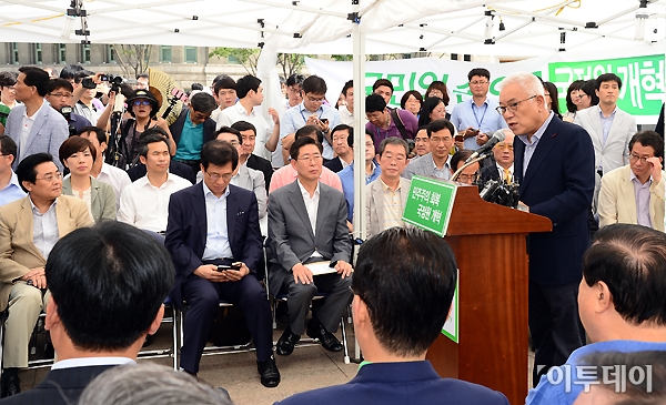 민주당 의원총회가 1일 오전 서울 시청 앞 광장에서 마련된 ‘민주주의 회복과 국정원 개혁 국민운동본부’에서 진행됐다. 김한길 민주당 대표가 모두발언을 하고 있다. 노진환 기자 myfixer@