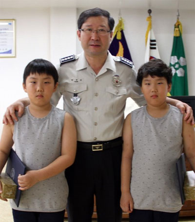 경찰은 쌍둥이 형제에게 눈높이 선행 표창장을 수여했다.