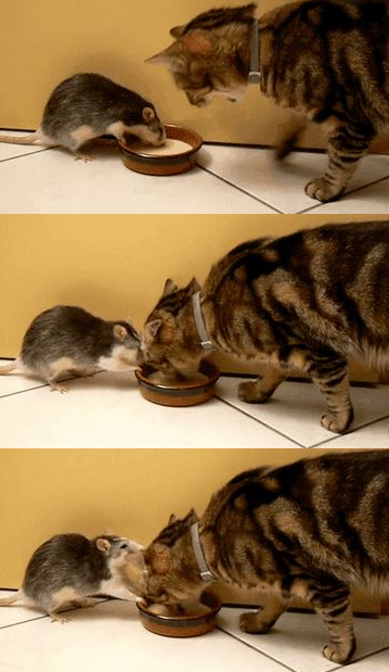 하지만 쥐는 갑작스런 고양이의 등장에도 불구하고, 조금도 아랑곳하지 않고 그릇을 자기 몸 쪽으로 끌어당겨 우유를 먹는다.