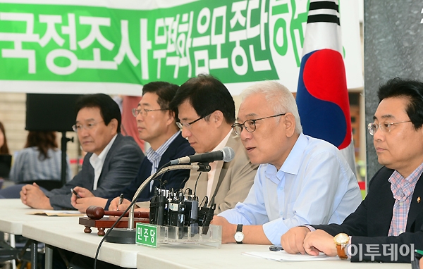 김한길 민주당 대표가 2일 오전 시청 앞 서울광장에 마련된 ‘민주주의 회복과 국정원 개혁 국민운동본부’에서 진행된 최고위원회의를 주재하고 있다. 노진환 기자 myfixer@