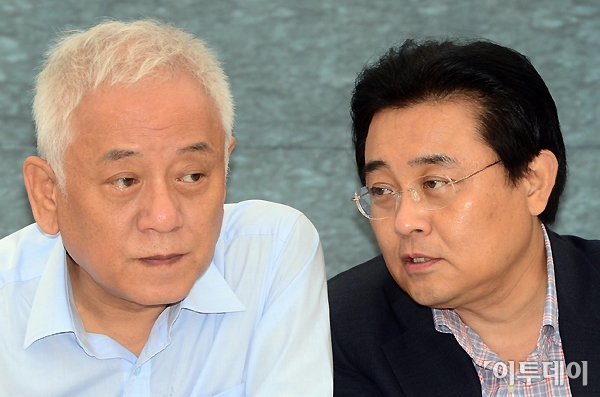 민주당 최고위원회의가 2일 오전 서울 시청 앞 서울광장에 마련된 ‘민주주의 회복과 국정원 개혁 국민운동본부’에서 진행됐다. 김한길 민주당 대표와 전병헌 원내대표가 이야기를 나누고 있다. 노진환 기자 myfixer@