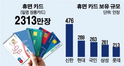 회사별 휴면카드 보유수는 신한카드가 476만장으로 가장 많았고 현대카드(289만장), 국민카드(263만장), 삼성카드(261만장), 롯데카드(213만장) 순이었다.
