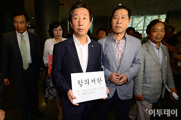 김성태 새누리당 의원을 비롯한 시의원 등이 2일 오전 서울시청에서 서울시 부실공사 사고와 관련해 기자회견을 갖고 항의서한을 전달하기 위해 시장실로 향하고 있다. 노진환 기자 myfixer@