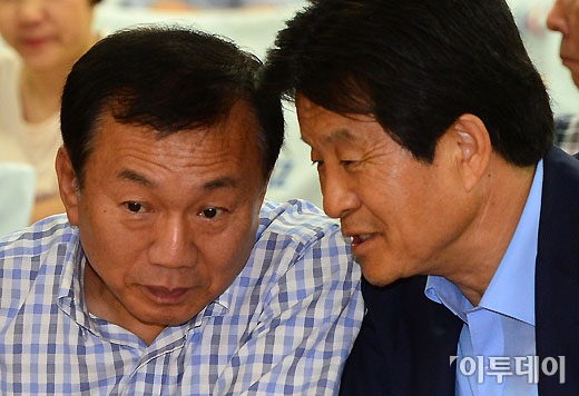 개성공단 입주기업 판로지원 정부 합동설명회가 2일 서울 여의도 중소기업중앙회에서 열렸다. 이날 회의에서 한재권 비상대책위원회 공동대표위원장이 문창섭 공동위원장과 대화를 나누고 있다. 양지웅 기자 yangdoo@
