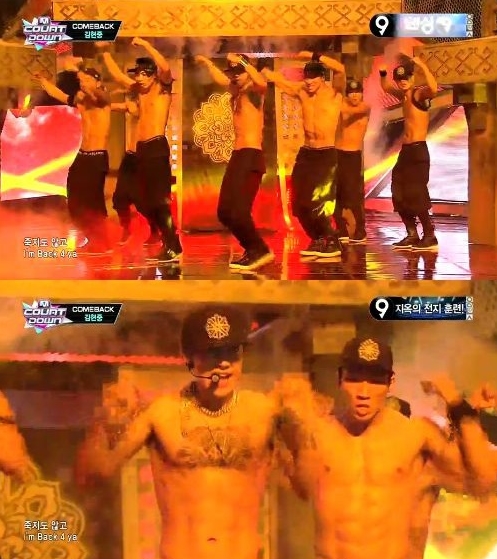 이날 김현중은 힙합 전사를 연상케 하는 블랙의상을 입고 화려한 퍼포먼스로 무대를 장악했다. 노래가 끝나갈 무렵 김현중은 옷을 찢으며 상의탈의를 했고, 조각 같은 근육이 훤히 드러났다.