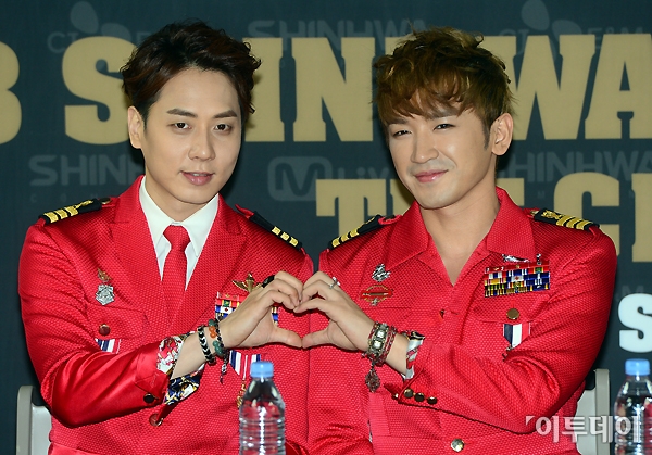 그룹 신화의 멤버 앤디와 이민우가 4일 오후 서울 송파구 방이동 올림픽공원 체조경기장에서 열린 ‘2013 신화 그랜드 피날레 더 클래식 인 서울’ 기자회견에 참석해 포즈를 취하고 있다. 노진환 기자 myfixer@