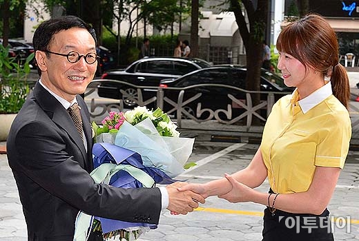 이건호 신임 국민은행장이 5일 오전 서울 영등포구 여의도 KB국민은행 본사 출근길중 직원에게 꽃다발을 받고 있다. 이 행장의 정상출근은 지난 22일 취임 이후 15일만이다. 방인권 기자 bink7119@