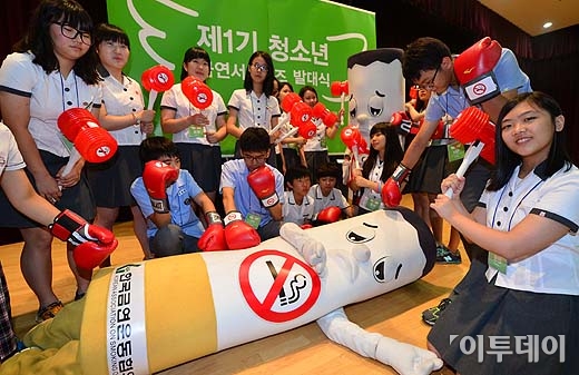 ‘2013 제 1기 청소년 금연 서포터즈 발대식’이 5일 오후 서울 종로구 계동 보건복지부에서 열렸다. 이날 발대식에서 서포터즈들이 친구와 가족의 건강을 괴롭히는 담배를 KO시키는 퍼포먼스를 벌이고 있다. 1,099명으로 구성된 금연 서포터즈는 청소년들이 많이 이용하는 PC방, 도서관, 공원, 스포츠경기장 등에서 금연 캠페인을 펼칠 예정이다. 방인권 기자 bink7119@