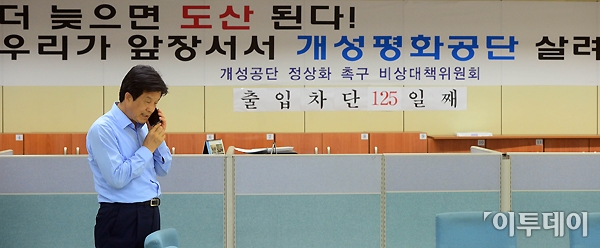 개성공단 출입차단 125일째를 맞는 5일 오후 여의도 개성공단 정상화 촉구 비상대책위원회에서 관계자가 심각하게 통화를 하고 있다. 노진환 기자 myfixer@