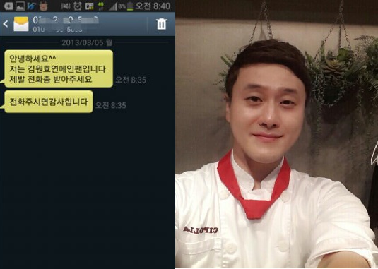김원효 고충 토로 사진에는 팬이 보낸 휴대폰 문자 메시지가 담겨 있다. 팬은 "안녕하세요 저는 김원효 연예인 팬입니다. 제발 전화 좀 받아주세요. 전화 주시면 감사합니다"라고 문자를 남겼다. 김원효는 이 팬의 끊임없는 전화로 생활에 지장을 받은 것으로 보인다.