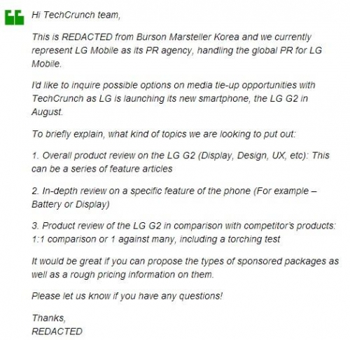 해당 보도에 따르면 테크크런치는 최근 LG전자의 해외홍보를 맡고 있는 버슨마슨텔러코리아 측으로부터 “곧 출시될 LG G2폰과 관련해 미디어 제휴를 맺고 싶다”는 내용의 이메일을 받았다. LG G2의 전반적인 제품 리뷰나 디스플레이, 디자인, 배터리, UX 등에 대한 심층리뷰, 또는 극악 환경에서 경쟁제품과 비교한 기사 등을 써주면 돈을 주겠다는 내용이었다. 여기에 기사에 대한 대가로 얼마를 지불하면 되는지 알려달라는 내용도 포함돼 있다.