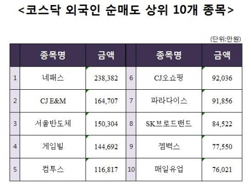 [코스닥 외국인 순매도 상위 10개 종목]