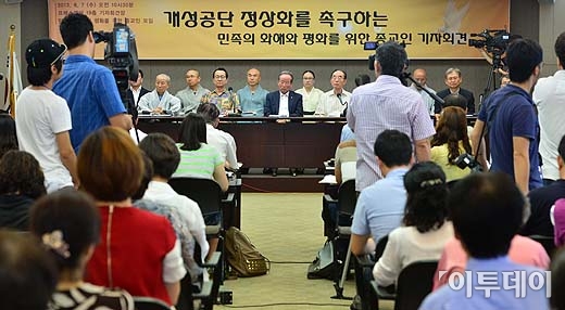 민족의 화해와 평화를 위한 종교인 모임 회원들이 7일 오전 서울 중구 프레스 센터에서 개성 공단 정상화를 촉구하는 기자회견을 하고 있다. 방인권 기자 bink7119@