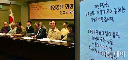 민족의 화해와 평화를 위한 종교인 모임 회원들이 7일 오전 서울 중구 프레스 센터에서 개성 공단 정상화를 촉구하는 기자회견을 열고 있다. 방인권 기자 bink7119@