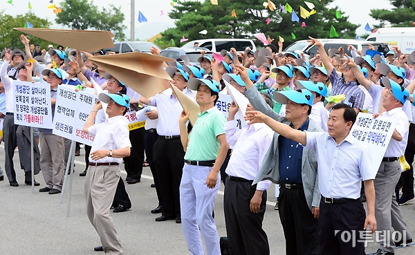 개성공단 정상화 촉구 궐기대회가 출입차단 127일째인 7일 오전 파주시 임진각 망배단 앞에서 열렸다. 한재권 대표공동위원장과 입주 기업인들이 정상화를 염원하며 종이비행기를 날리고 있다. 노진환 기자 myfixer@