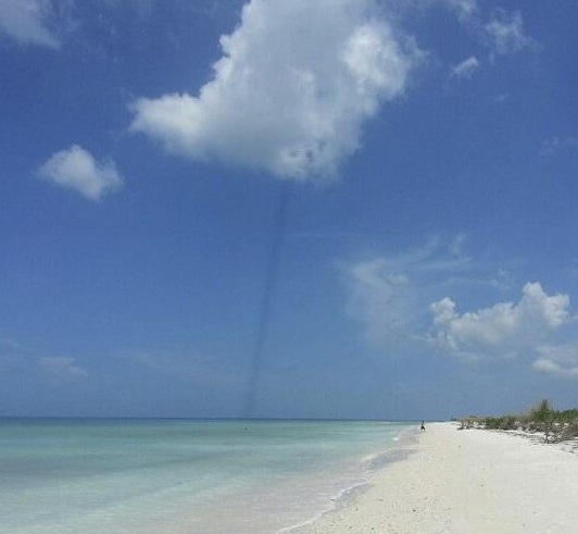 파란 하늘과 바다를 배경으로 촬영된 이 사진에서는 하늘에 떠있는 하얀구름에서 거무스름한 줄 하나가 일직선으로 내려오고 있다.