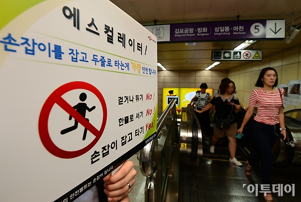 서울도시철도공사가 에스컬레이터 두 줄서기의 빠른 정착을 위해 홍보캠페인을 전개한다. 8일 오전 서울 여의도역에서 직원들과 관계자들이 손팻말을 들고 시민들에게 에스컬레이터 두 줄서기에 동참해 줄 것을 호소하고 있다. 노진환 기자 myfixer@