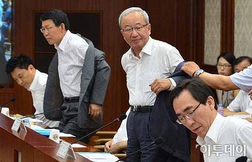 현오석 경제부총리 겸 기획재정부 장관을 비롯한 참석자들이 8일 오전 서울 세종로 정부서울청사에서 열린 '대외경제장관회의'에 앞서 자켓을 탈의하고 있다. 방인권 기자 bink7119@