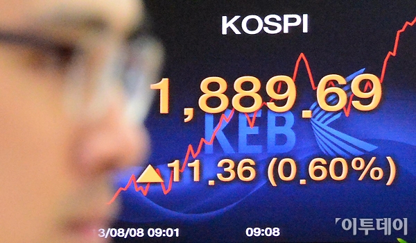 코스피지수가 개인과 기관의 동반 매수에 4일만에 상승세로 장을 열었다. 코스피지수는 8일 오전 9시 11분 현재 전거래일 대비 9.99p(0.53%) 오른 1888.32를 나타내고 있다. 이날 오전 을지로 외환은행 본점 딜링룸에서 관계자가 신중하게 모니터를 응시하고 있다. 노진환 기자 myfixer@
