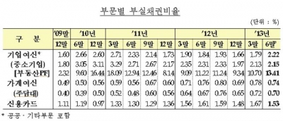 이에 따라 기업여신 부실채권비율은 2.22%를 기록하며 이 역시 2년 만에 최고 수준을 보였다. 일부 경기민감 업종의 잠재부실 현실화와 대기업 신용위험 정기평가(2013년 7월) 등의 영향으로 전분기(1.79%)보다 0.43%포인트 오른 것이다. 특히 조선업(1.83%→6.86%) 및 해운업(1.65%→6.59%)의 부실채권 비율이 5%포인트 가량 대폭 상승했다.