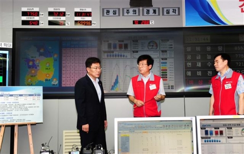 ▲윤상직 산업통상자원부 장관(왼쪽 첫번째)이 8일 전력거래소를 찾아 남호기 이사장(왼쪽 두번째)로부터 전력수급 상황을 보고 받고 있다. (사진=산업통상자원부)