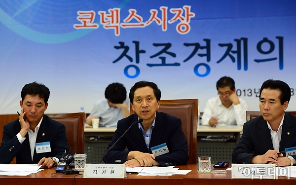 김기현 새누리당 정책위의장이 8일 오후 한국거래소에서 코넥스 시장 활성화 방안 모색을 위한 정책위원회 하계 ‘민생힐링 현장방문’에 참석해 인사말을 하고 있다. 노진환 기자 myfixer@