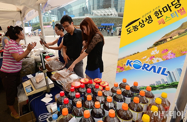 코레일과 한국농수산식품유통공사 공동으로 9일 오전 서울역 광장에서 ‘도농상생 한마당 페스티벌’이 개최됐다. 이날 오전 행사장을 찾은 시민들이 지역 특산품을 살펴보고 있다. 이번 행사에는 전국 40여 개의 우수전통식품업체 및 지방자치단체 등이 참여했다. 노진환 기자 myfixer@
