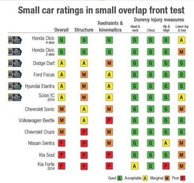 이번 테스트는 미국 시장에서 가장 많이 판매되고 있는 소형 모델 12종을 대상으로 실시됐다. 혼다 시빅 2도어와 4도어는 이번 실험에서 유일하게 가장 안전한 차에게 선사되는 G(Good)등급을 받았다.