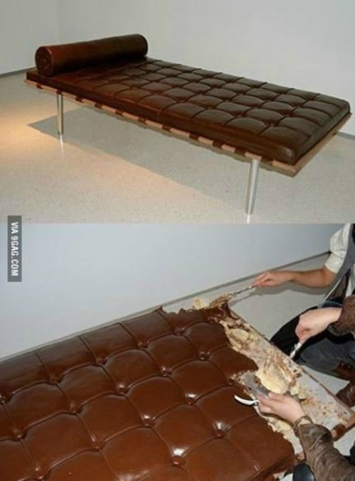 ‘케이크 침대’ 사진에는 싱글 사이즈의 가죽 제질 침대가 담겨 있다. 단추와 가죽의 주름까지 생생하게 표현됐지만 이는 착시 효과. 다른 사진에는 침대를 잘라 먹는 모습이 담겼다.