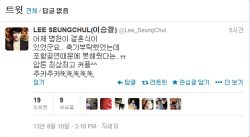 11일 이승철은 자신의 트위터에 “어제 병헌이 결혼식이 있었군요. 축가 부탁했었는데 포항 공연때문에 못해줬다는. 암튼 최상최고 커플 추카추카”라는 글을 올려 전날 결혼한 이병헌-이민정 부부에게 미안한 마음을 전했다.