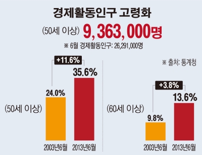 10년 전에 견줘서는 12%포인트나 상승했다. 2003년 6월 이 비중은 불과 24%지만 최근 10년 새 경제활동인구 중 50세 이상 비중이 11.6%포인트 오른 것이다. 이는 우리 사회의 거대 인구 축인 베이비붐 세대(1955∼1963년생)가 50대에 대거 포진한 이유도 있지만 경제적 여유 부족으로 장·노년층의 경제활동이 활발해진 탓으로 분석된다.