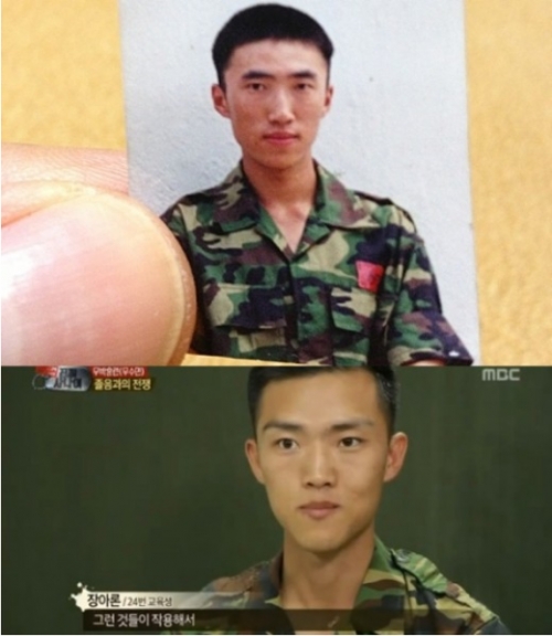 공개된 '장아론 장동민 닮은꼴' 사진 속 장동민은 군기가 바짝 든 표정으로 차렷 자세를 취하고 있다. 왜소한 몸짓과 까무잡잡한 피부까지 MBC '일밤-진짜 사나이' 모범 병사 장아론의 모습과 너무도 흡사해 보는이의 웃음을 자아낸다.
