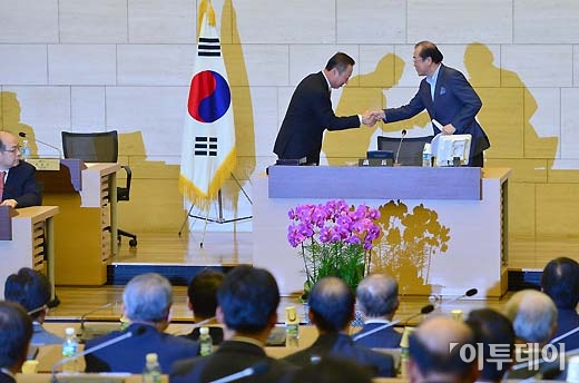 박용만 두산그룹 회장이 12일 서울 남대문 대한상공회의소 의원회의실에서 열린 서울상의 임시의원총회에서 만장일치로 서울상의 회장에 선출됐다. 이날 총회에서 박 회장이 서민석임시 의장과 악수를 나누고 있다. 박 회장은 서울상의 회장이 대한상의 회장에 추대되는 관례에 따라 오는 21일 대한상의 임시의원총회에서 대한상의 회장으로 선출될 전망이다. 양지웅 기자 yangdoo@