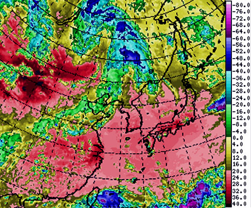 우리나라가 연일 30도 이상의 찜통 더위로 비상인 가운데 다른 동아시아 국가도 폭염으로 가뭄과 인명피해가 발생하는 등 몸살을 앓고 있다. 사진은 12일 기상청이 제공한 실시간 기온분포도로 한국을 포함해 중국ㆍ일본 전역이 붉은색으로 표시되고 있다.