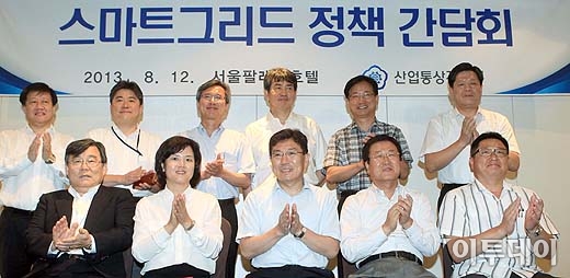 윤상직 산업통상자원부 장관이 12일 오전 서울 서초구 반포동 팔래스호텔에서 열린 '스마트그리드 전문가들과의 정책간담회'에서 참석자들과 기념촬영을 하고 있다. 방인권 기자 bink7119@