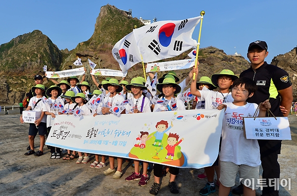 광복절을 사흘 앞두고 있는 12일 오후 CJ제일제당 ‘어린이 독도지킴이’ 대원들이 경상북도 울릉군 독도를 방문해 태극기를 꽂고 국내 최초 국산 김 종자 ‘전남슈퍼김 1호’를 바다에 뿌리는 ‘독도수호, 종자수호’ 퍼포먼스를 진행했다. ‘어린이 독도 지킴이’ 대원들이 태극기를 흔들고 있다. 노진환 기자 myfixer@