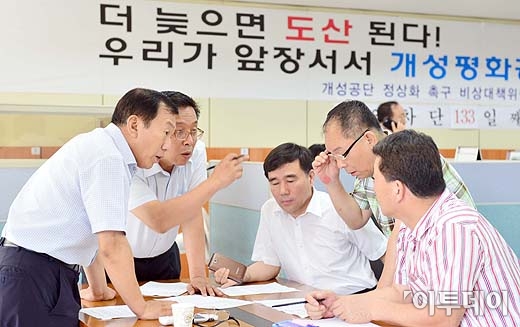 한재권 개성공단 정상화 촉구 비상대책위원회 위원장과 관계자들이 남북 7차 실무회담을 앞둔 13일 오전 서울 영등포구 여의도동 비대위 사무실에서 기자회견에 앞서 이야기를 나누고 있다. 이날 비대위는 전제조건 없는 재발방지로 개성공단의 안정적 경영활동 보장을 마련해 주기를 바란다"며 "개성공단의 조속한 정상화를 위해 설비유지 보수인원의 방북을 허용해 달라"고 촉구했다. 방인권 기자 bink7119@