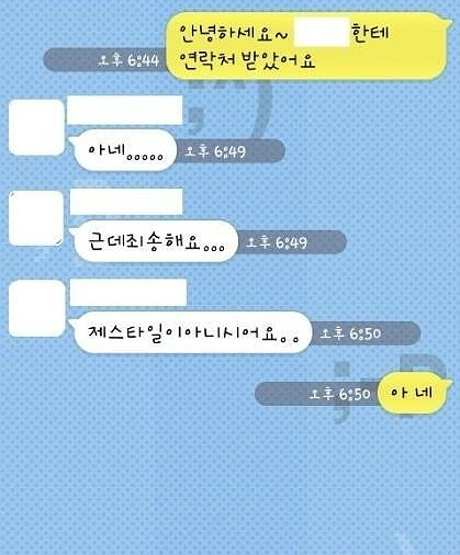 먼저 남자가 “안녕하세요. OO한테 연락처 받았어요”라고 메시지를 보내자 상대방 여자는 “죄송해요. 제 스타일이 아니세요”라는 돌직구를 날려 웃음을 자아낸다.