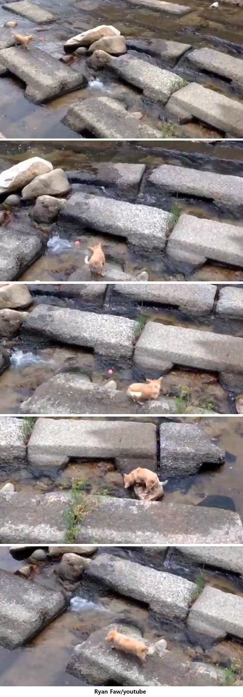 영상 속 개는 강가 돌다리에서 혼자 공놀이를 하고 있다. 이 개가 하는 공놀이는 흐르는 강물에 공을 던진 후 공이 물살을 타고 하류로 내려가기 전 다시 물어 오는 것을 반복하는 것이다.
