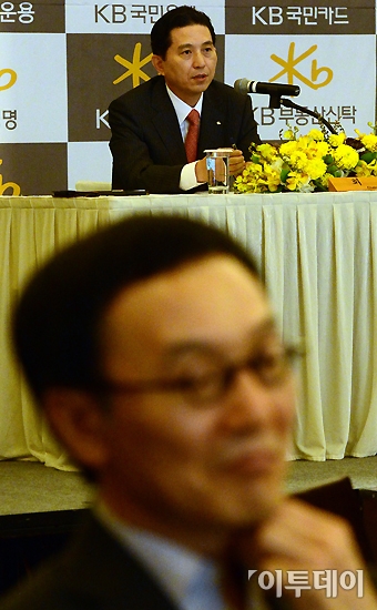 임영록 KB금융지주 회장이 14일 소공동 웨스틴 조선호텔에서 열린 기자간담회에 참석해 취재진의 질문에 답하고 있다. 노진환 기자 myfixer@