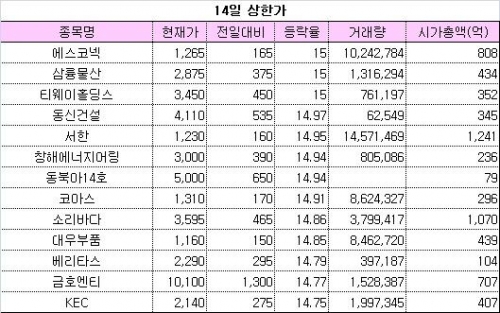 14일 한국거래소에 따르면 코스피 5개, 코스닥 8개 등 총 13개 종목이 상한가로 마감했다.