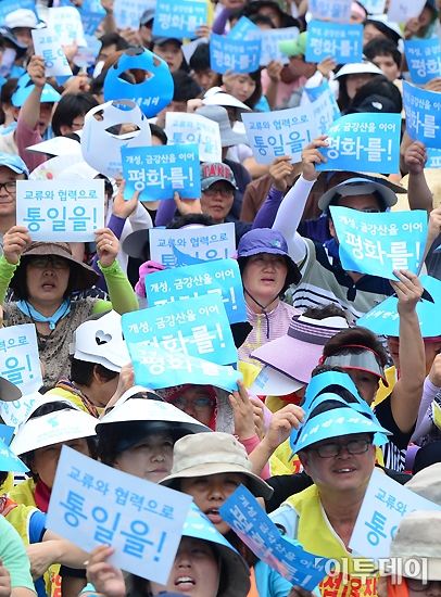 광복 68주년 기념 815평화통일대회가 15일 오후 서울역광장에서 열렸다. 행사에 참석한 시민들이 통일을 염원하며 구호를 외치고 있다. 노진환 기자 myfixer@
