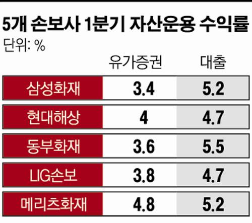 삼성화재의 1분기 유가증권 수익률은 전년동기 대비 3.4%로 5개 손보사 중 가장 낮았다. 현대해상은 4.0%를 기록했으며 동부화재와 LIG손보는 각각 3.7%와 3.8%를 기록했다.