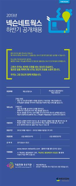 넥슨네트웍스는 전국‘특성화 고등학교 졸업예정자 전형’을 신설, 2013년 하반기 신입사원 공개채용을 실시한다고 16일 밝혔다.
