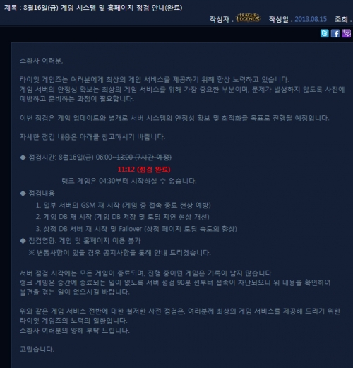 앞서 라이엇게임즈는 공식 홈페이지에 "리그오브레전드는 현재 서비스 점검 중입니다. 소환사 여러분께 보다 안정적인 서비스 환경을 제공하기 위해 점검을 진행 중에 있습니다. 약속한 시간 내에 점검을 마칠 수 있도록 최선을 다하겠습니다. 이용에 불편을 드려 죄송합니다"라고 밝힌 바 있다.